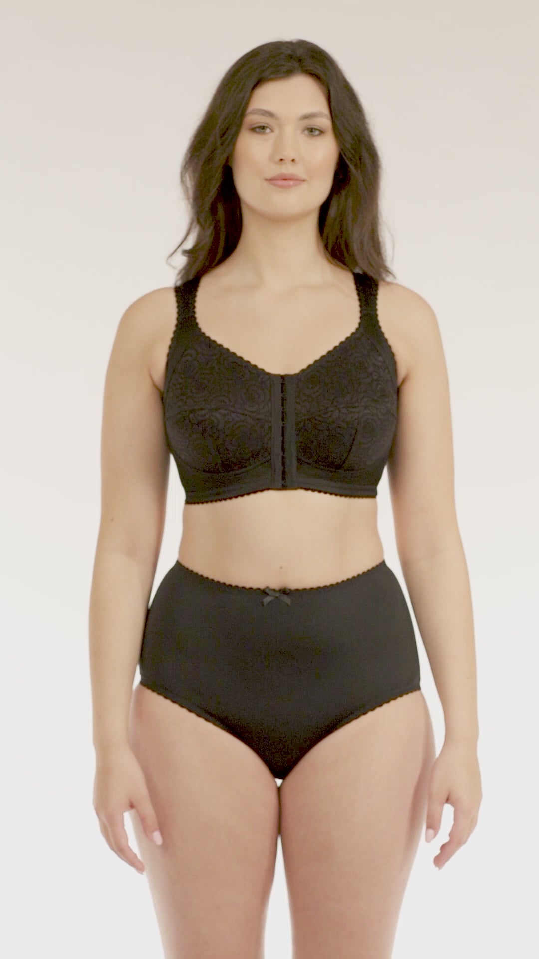 Biustonosz bez fiszbin zapinany z przodu jest idealnym wyborem dla kobiet o większym biuście. Specjalna konstrukcja pleców podtrzymuje plecy przez cały dzień. Wysoko wycięte miseczki w kształcie litery T tworzą lekko spiczastą sylwetkę. Miseczki zdobione koronką nadają jej kobiecy charakter . Szerokie, wyściełane, wzmocnione ramiączka zapewniają dodatkowy komfort i wsparcie.